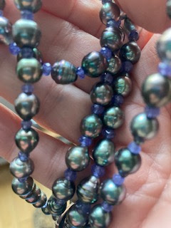 Gemstone beads are also used between pearls. This is my 33 in. rope of Tahitian circlé pearls strung with faceted Tanzanite beads (Kojima Pearl).