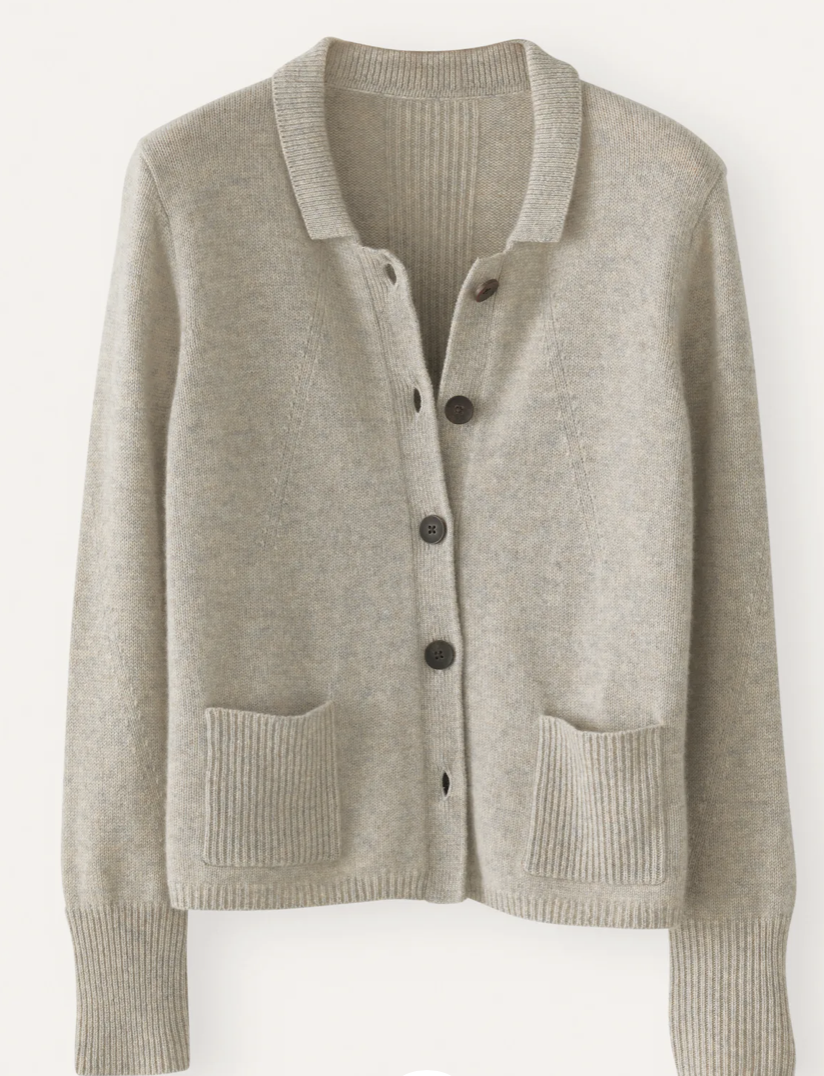 A luxe item you'll never regret: a cashmere collared cardigan, warmer than a sweater, lighter than a jacket. This style—a collar and pockets— is hard to find. From Poetry; colour shown is Pebble; also made in Aqua and Hedgerow. Price, £259 and a bouquet of tulips to Poetry for offering sizes in UK 6-22.